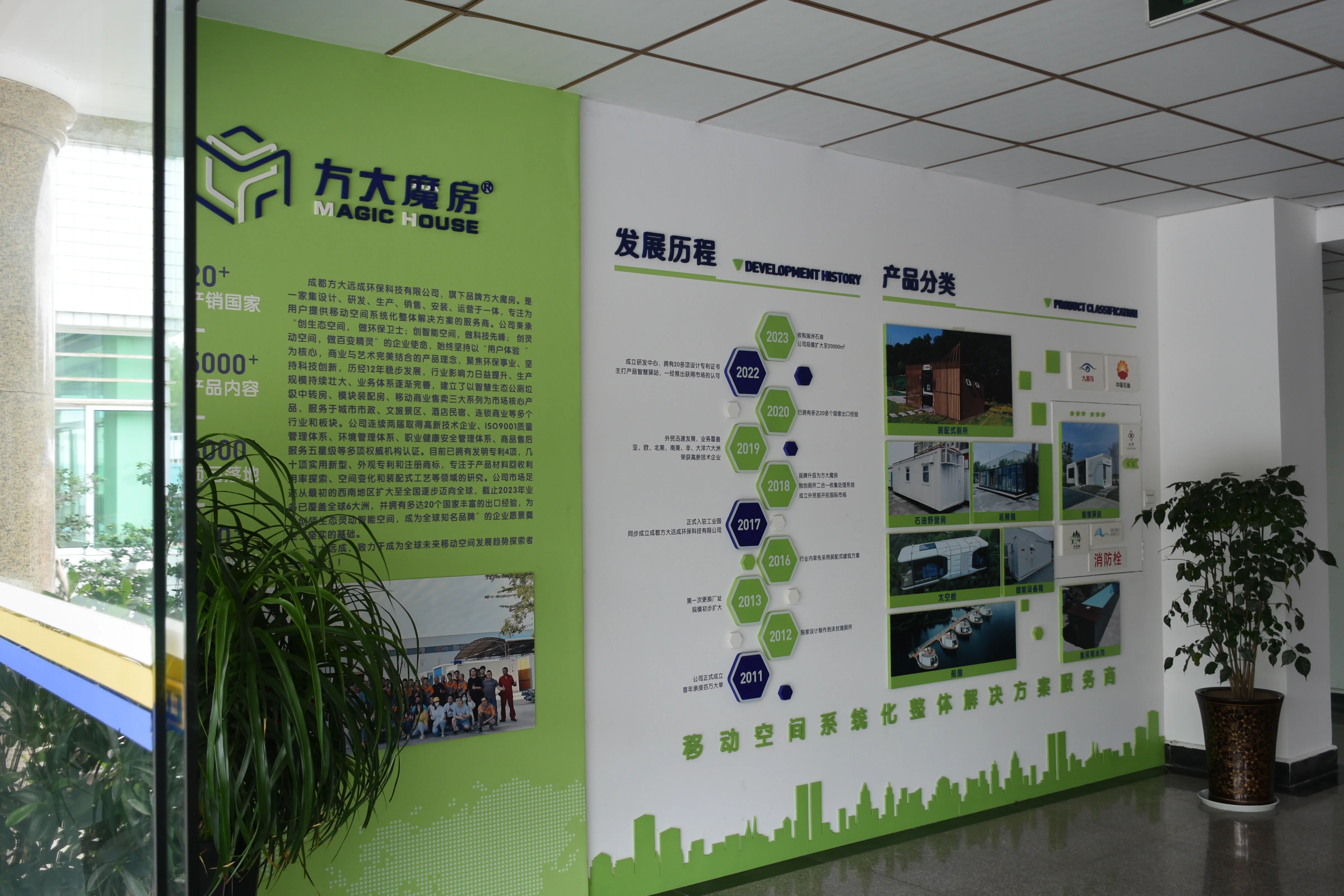 成都方大远成环保科技有限公司初创于2010年,其前身成都方大彩钢结构工程有限公司,是一家集设计、研发、生产、销售、安装、运营于一体,专注为用户提供移动空间系统化整体解决方案的服务商。2017年入驻青白江大成工业园后成立成都方大远成环保科技有限公司,并注册商标“方大魔房”,借助青白江国家级自贸区优势,于2018年成立外贸部,以“MAGIC HOUSE”为品牌正式进军国际市场,目前业务已覆盖全球6大洲,并拥有出口30多个国家的丰富外销经验,为实现“创领生态灵动智能空间,成为全球知名品牌”的企业愿景奠定了坚实的基础。2023年公司收购四川瑞洲石油科技开发有限公司,整体迁入金堂赵镇工业园区,正式拥有了自己的独立厂房,办公楼、宿舍楼、材料库房、生产车间、成品车间、···